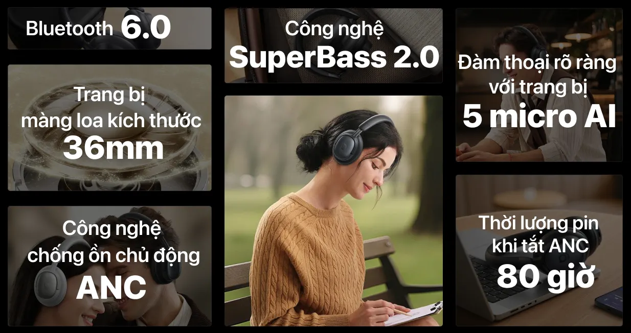 Công nghệ SuperBass 2.0 tự động điều chỉnh tần số thấp theo thời gian thực, mang lại âm trầm mạnh mẽ, sống động. Nhờ Baseus Immersive Spatial Acoustics (BISA), tai nghe tạo hiệu ứng âm thanh vòm, đem đến không gian âm thanh sống động.