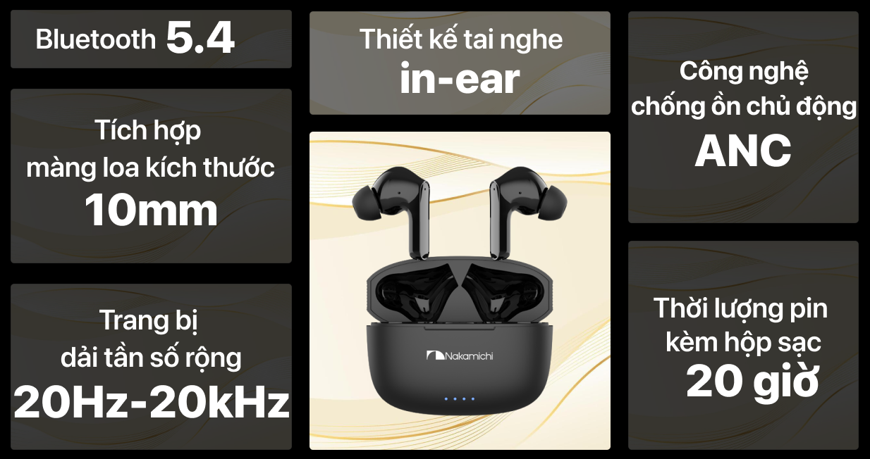 Giảm đến 1 triệu khi thanh toán qua thẻ tín dụng ACBTai nghe không dây Nakamichi Hue-Tulip được trang bị công nghệ chống ồn ANC 25dB ấn tượng, màng loa 10 mm phổ biến và kết nối Bluetooth 5.4 hiện đại. Thiết bị hỗ trợ codec AAC/SBA giúp trải nghiệm âm thanh thêm sống động. Thời lượng pin lên đến 20 giờ khi sạc đầy bằng dock sạc đi kèm và tuỳ theo mức âm lượng sử dụng.