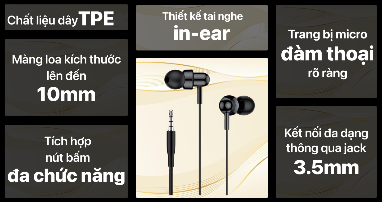 Chất liệu dây tai nghe sử dụng dây TPE đàn hồi tốt, giảm bị rối xoắn. Không những vậy, chất liệu này còn giúp dây có độ mềm dẻo, dễ cuộn lại gọn gàng. Ngoài ra, phiên bản sở hữu màu sắc hiện đại, dễ phối hợp cùng nhiều phong cách cá nhân.