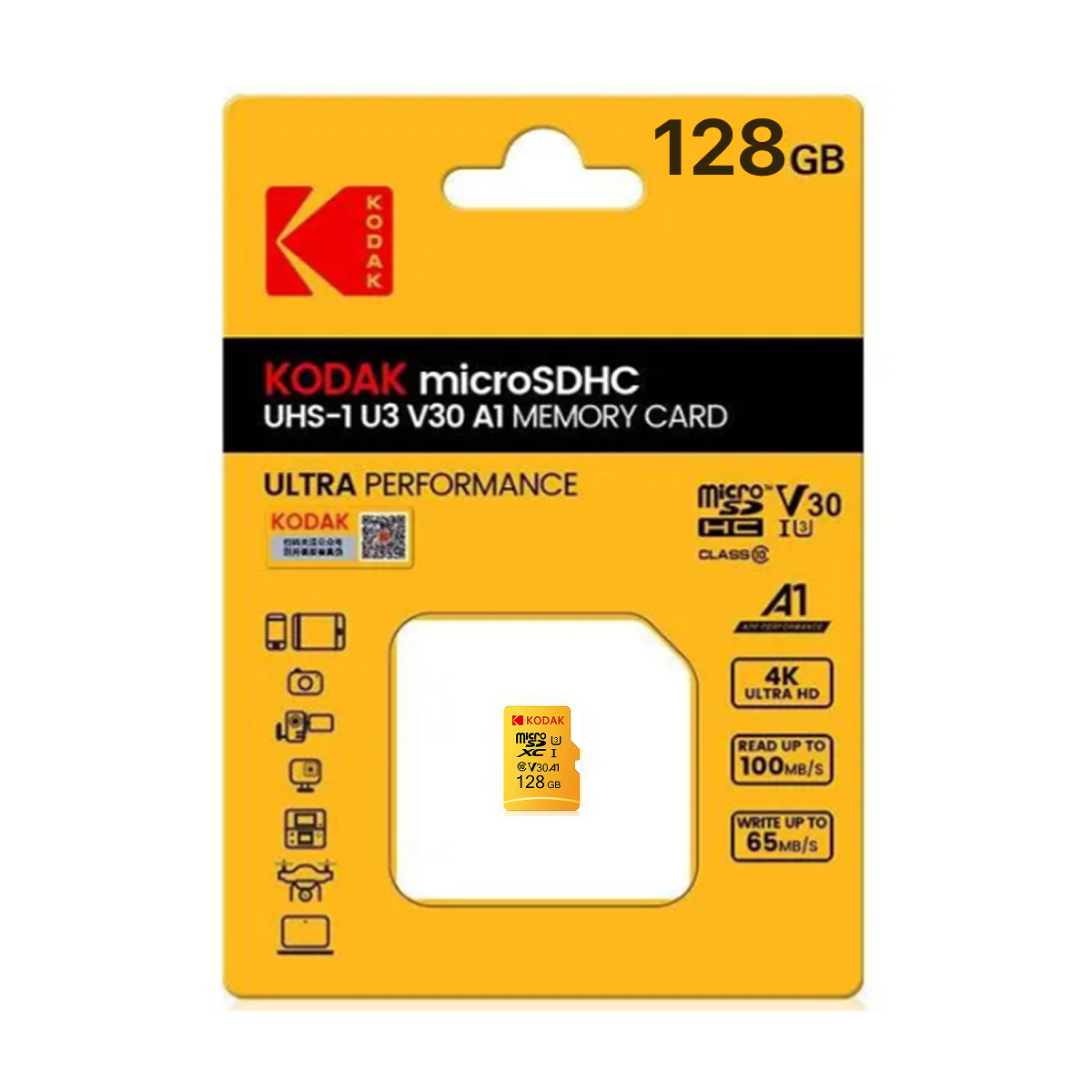 Thẻ nhớ MicroSD Kodak 128GB UHS-I U3/V30/A1 ADAPTER sở hữu tốc độ đọc lên tới 100MB/s giúp người dùng thực hiện các tác vụ lưu trữ dữ liệu nhanh chóng. Thiết bị đạt chuẩn V30 hỗ trợ quay video 4K sắc nét cùng chuẩn A1 tối ưu hiệu năng vận hành ứng dụng. Sản phẩm còn đi kèm adapter tiện lợi.