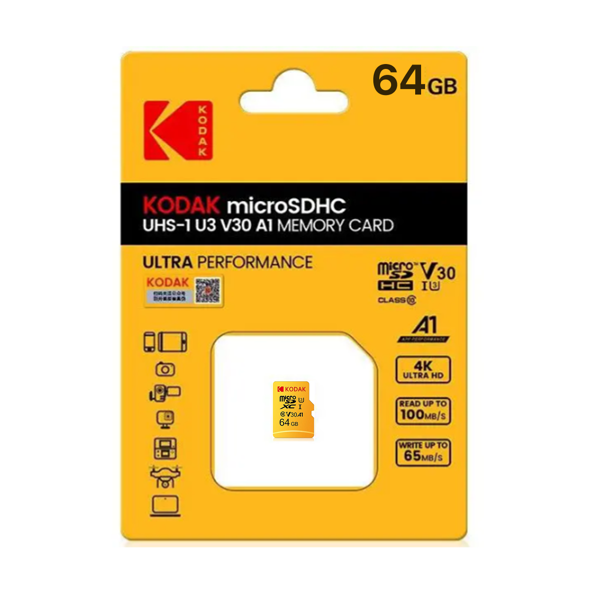 Thẻ nhớ MicroSD Kodak 64GB UHS-I U3/V30/A1 (Adapter) cung cấp dải dung lượng đa dạng, hỗ trợ tăng thêm không gian lưu trữ cho các thiết bị kỹ thuật số. Chuẩn tốc độ video V30 hỗ trợ ghi hình ở độ phân giải 4K ổn định. Tốc độ đọc dữ liệu tối đa 100 MB/s trong điều kiện tiêu chuẩn giúp việc sao chép tập tin diễn ra nhanh chóng.