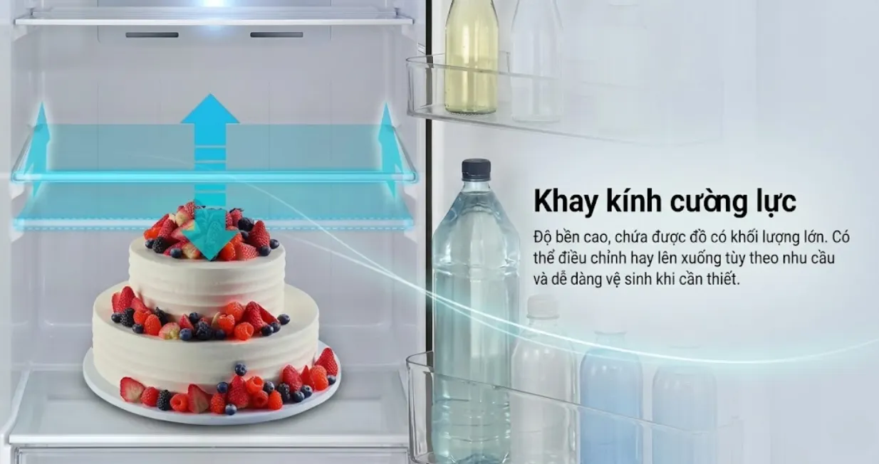 Với chất liệu kính cao cấp, các khay ngăn lạnh đảm bảo sự bền bỉ và độ an toàn. Khay kính không chỉ chịu được trọng lượng lớn mà còn làm sạch đơn giản, giúp không gian bên trong tủ luôn gọn gàng và sáng bóng.