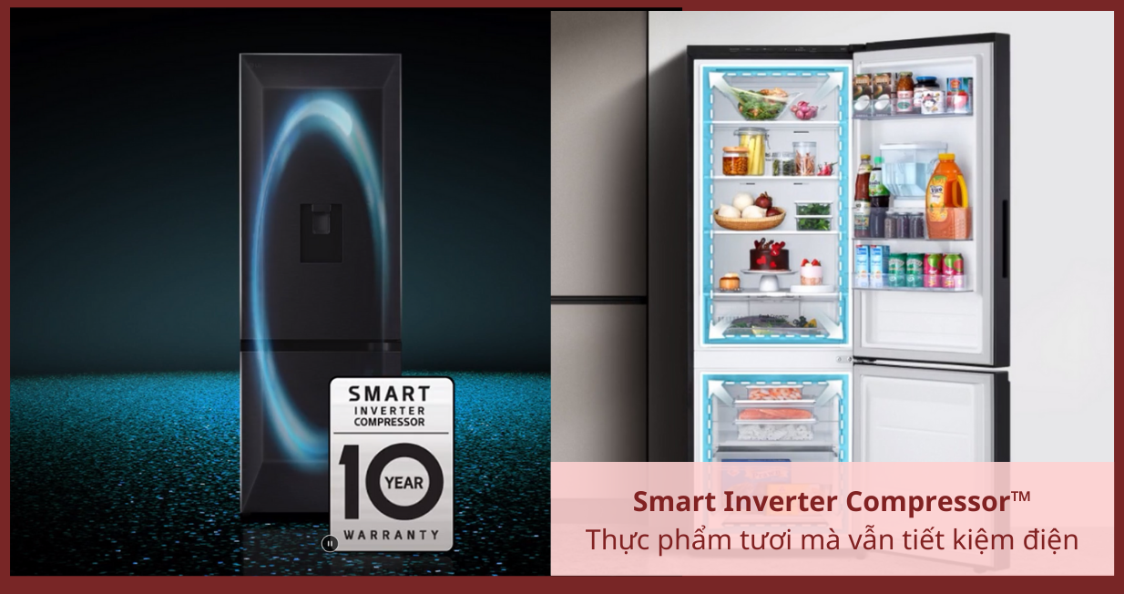 Smart Inverter Compressor giúp tủ lạnh hoạt động êm ái, tiết kiệm điện năng với mức tiêu thụ chỉ 386 kWh/năm, hỗ trợ giảm chi phí điện hàng tháng.