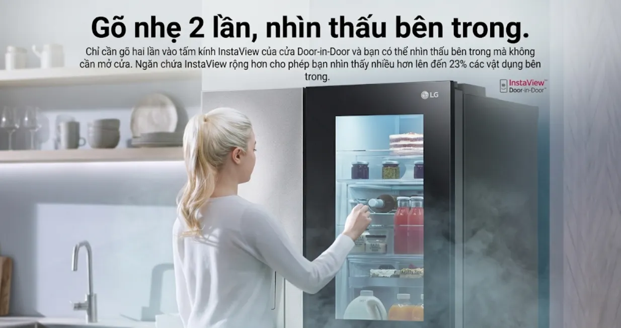 Hơn thế nữa, tủ lạnh còn có thiết kế InstaView Door-in-Door, cho phép cửa tủ trở nên trong suốt khi gõ hai lần. Thiết kế này sẽ giúp hạn chế tối đa việc mở cửa tủ, từ đó giảm thất thoát hơi lạnh ra bên ngoài và tiết kiệm điện đáng kể.