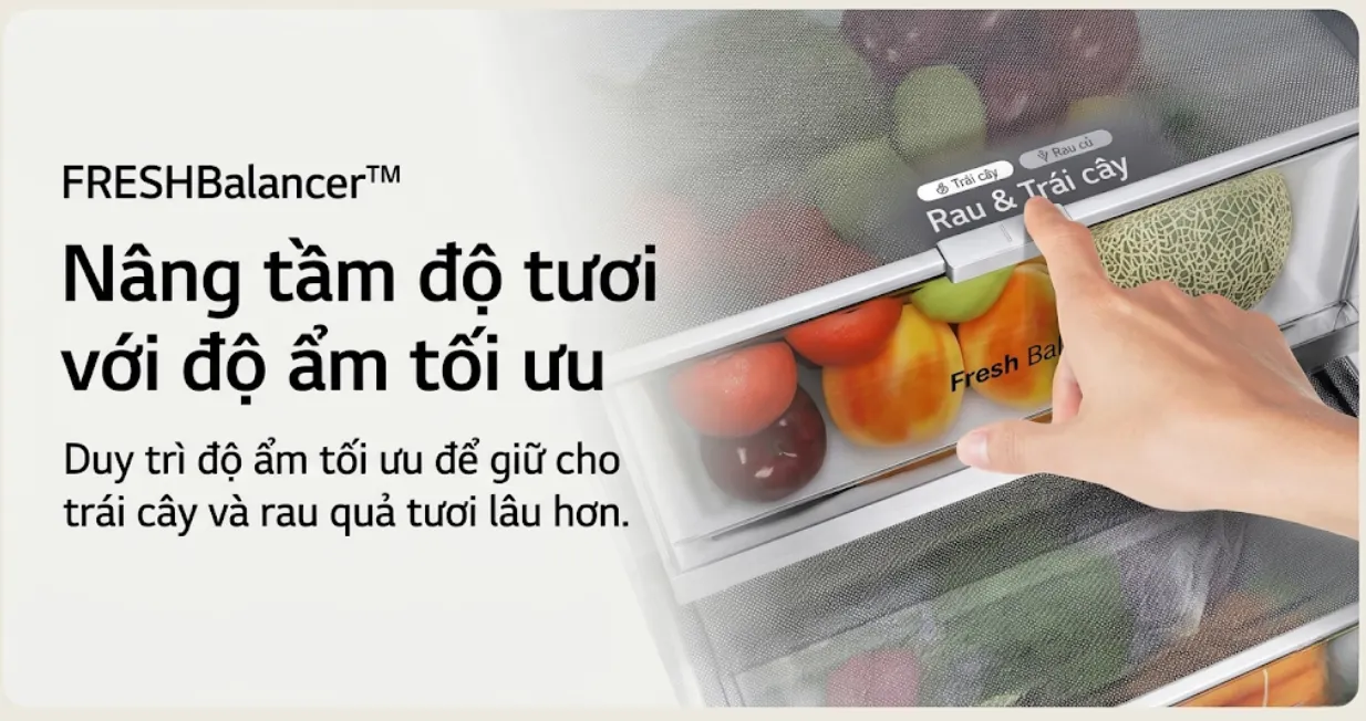 Ngăn rau củ Fresh Balancer trên tủ lạnh LG Inverter Side By Side GR-X257BL 635 lít được thiết kế đặc biệt để tối ưu hóa độ ẩm giúp bảo quản rau củ quả tươi lâu hơn. Ngăn này có hai chế độ điều chỉnh độ ẩm, một chế độ dành cho rau lá (cần độ ẩm cao để giữ độ tươi, tránh héo úa). Chế độ còn lại dành cho củ quả (cần độ ẩm thấp hơn để tránh úng nước, hư hỏng).
