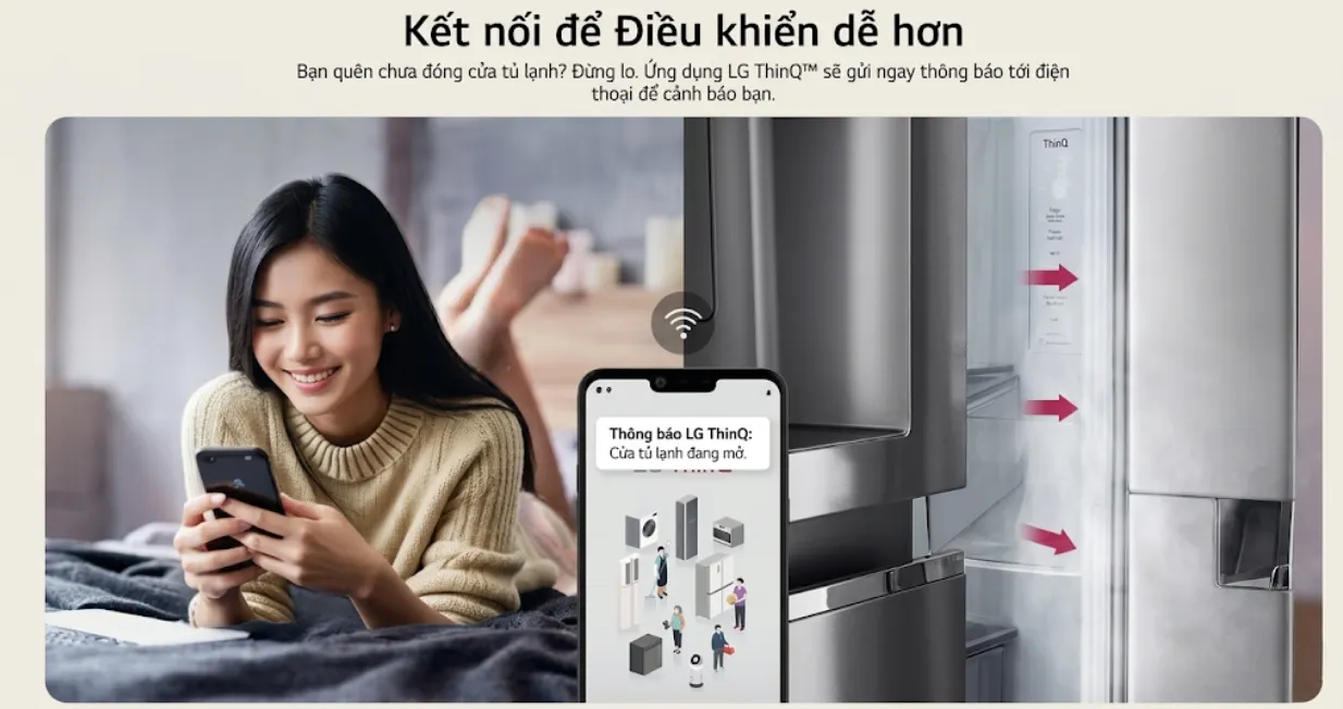 Tủ lạnh LG giờ đây có thể được quản lý mọi lúc mọi nơi nhờ ứng dụng LG ThinQ. Ứng dụng này cho phép điều chỉnh nhiệt độ của ngăn lạnh và ngăn đông, bật/tắt các chế độ làm lạnh nhanh và nhận thông báo khi cửa tủ mở quá lâu... Tính năng này giúp người dùng kiểm soát tủ lạnh từ xa, đảm bảo thực phẩm luôn được bảo quản trong điều kiện tối ưu.