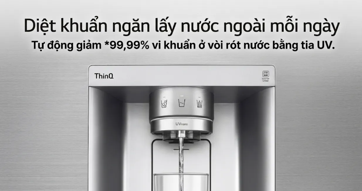 Tủ lạnh LG Inverter Side By Side GR-X257BL 635 lít được trang bị công nghệ diệt khuẩn UVnano tiên tiến tại vòi lấy nước ngoài. Công nghệ này sử dụng tia UV để loại bỏ vi khuẩn có hại trong nước trước khi sử dụng. Điều này đảm bảo rằng nước uống của gia đình luôn sạch khuẩn, an toàn cho sức khỏe của các thành viên, đặc biệt là đối với trẻ nhỏ và người lớn tuổi.