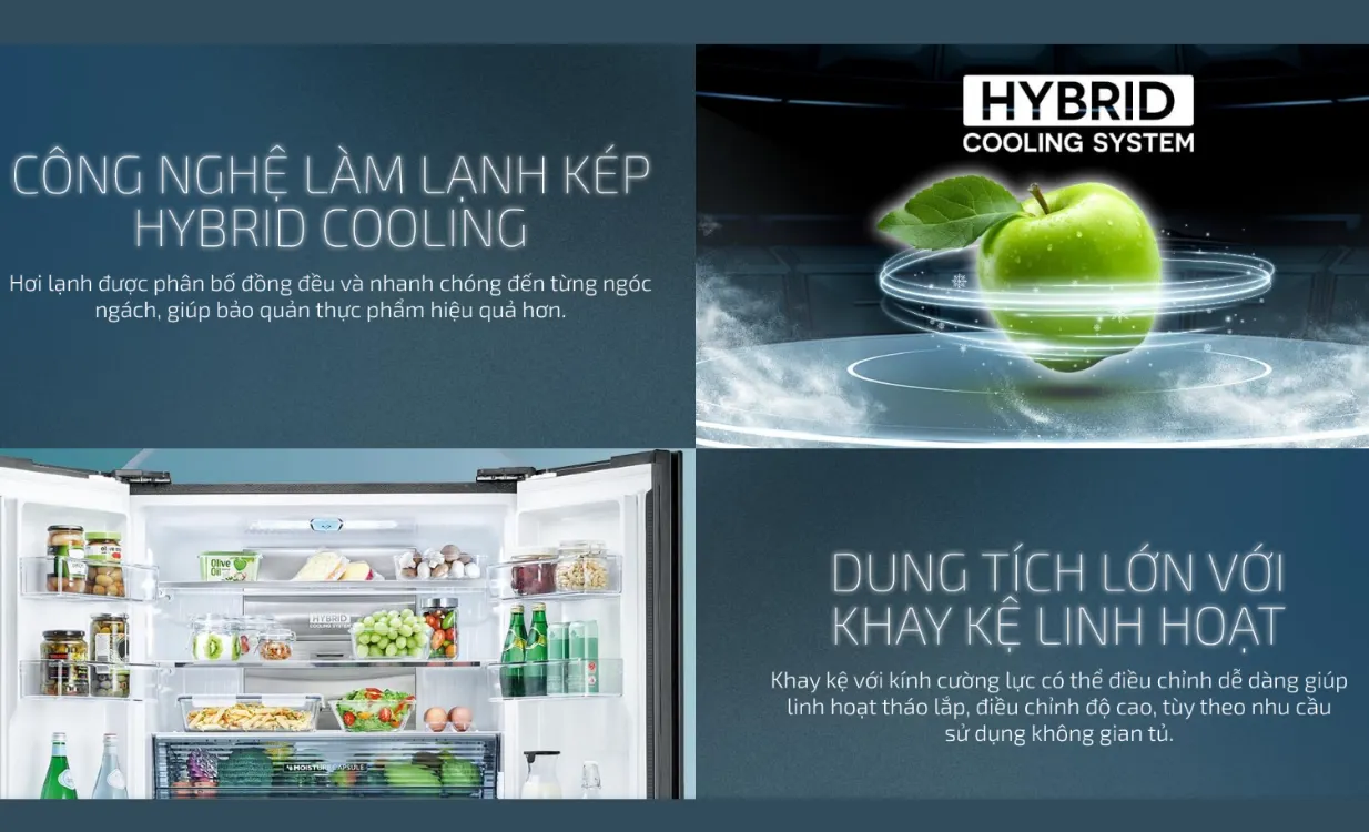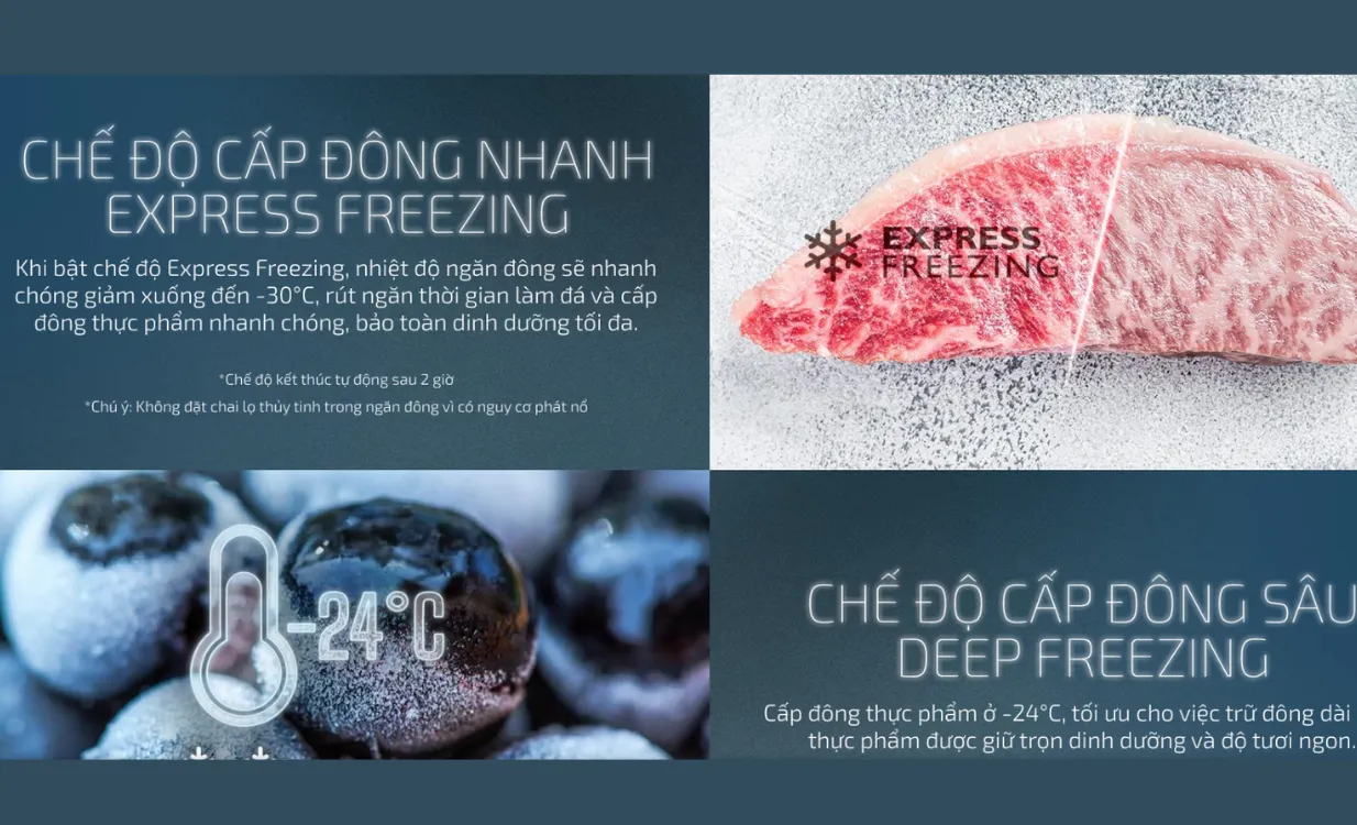 Ngoài ra, các ngăn kệ bên trong được làm từ kính chịu lực có khả năng chịu tải lên cao, giúp bảo quản thực phẩm an toàn và bền bỉ trong thời gian dài. Hơn thế nữa, cửa tủ linh hoạt với góc mở lên đến 120 độ, cho phép thao tác lấy thực phẩm ở các ngăn trong cùng trở nên thuận tiện. Không gian bên trong tủ cũng được tối ưu với hệ thống đèn LED chiếu sáng toàn phần.