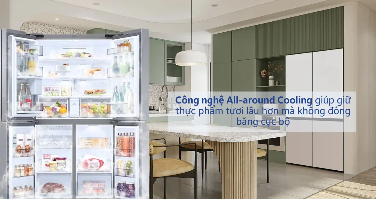 Tủ lạnh Samsung Inverter Multidoor Bespoke RF59CB66F8S/SV 648 lít đi kèm công nghệ làm lạnh hiện đại All-around Cooling giúp duy trì nhiệt độ đồng đều ở mọi vị trí trong tủ. Hệ thống cảm biến nhiệt độ này có khả năng phân tán đều luồng khí lạnh khắp các ngăn. Qua đó, tủ lạnh có thể bảo quản tốt các loại thực phẩm trong điều kiện tối ưu.