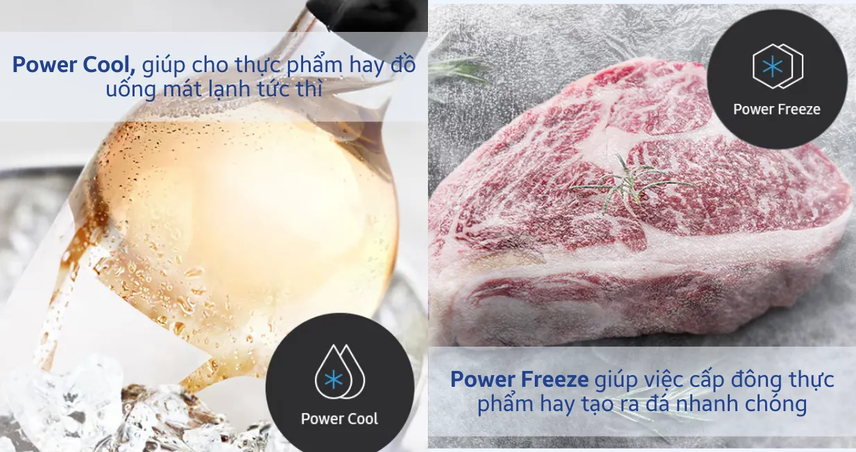 Bên cạnh đó, chế độ Power Cool sẽ tăng tốc làm lạnh, giúp đồ uống, thực phẩm đạt nhiệt độ lý tưởng nhanh chóng. Trong khi chế độ Power Freeze cho phép cấp đông nhanh thực phẩm trong vòng vài phút.