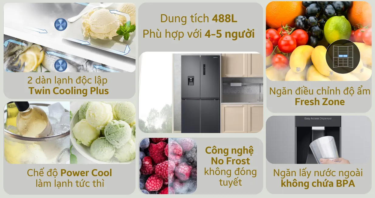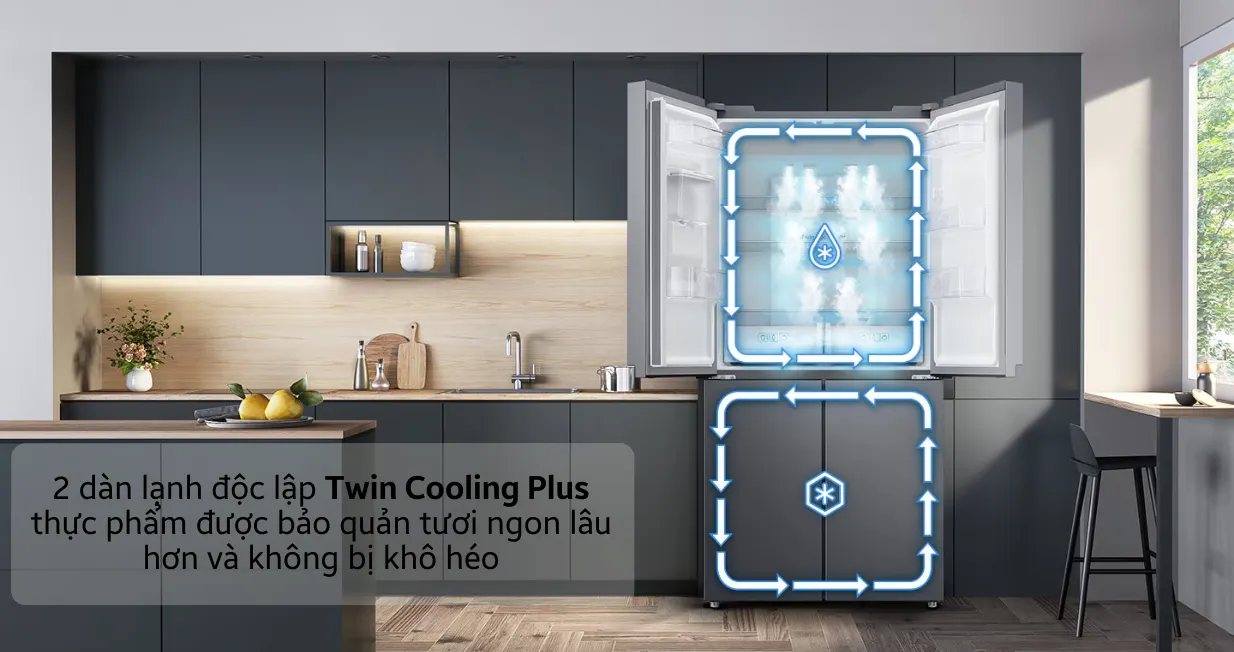 Tủ lạnh Samsung Inverter Multidoor RF48A4010B4/SV 488 lít nổi bật với công nghệ Twin Cooling Plus. Công nghệ này sử dụng hai hệ thống làm lạnh riêng biệt cho ngăn mát và ngăn đông, giúp nhiệt độ từng ngăn được kiểm soát chính xác. Bên cạnh đó, thiết kế này còn hỗ trợ duy trì độ ẩm tối ưu.