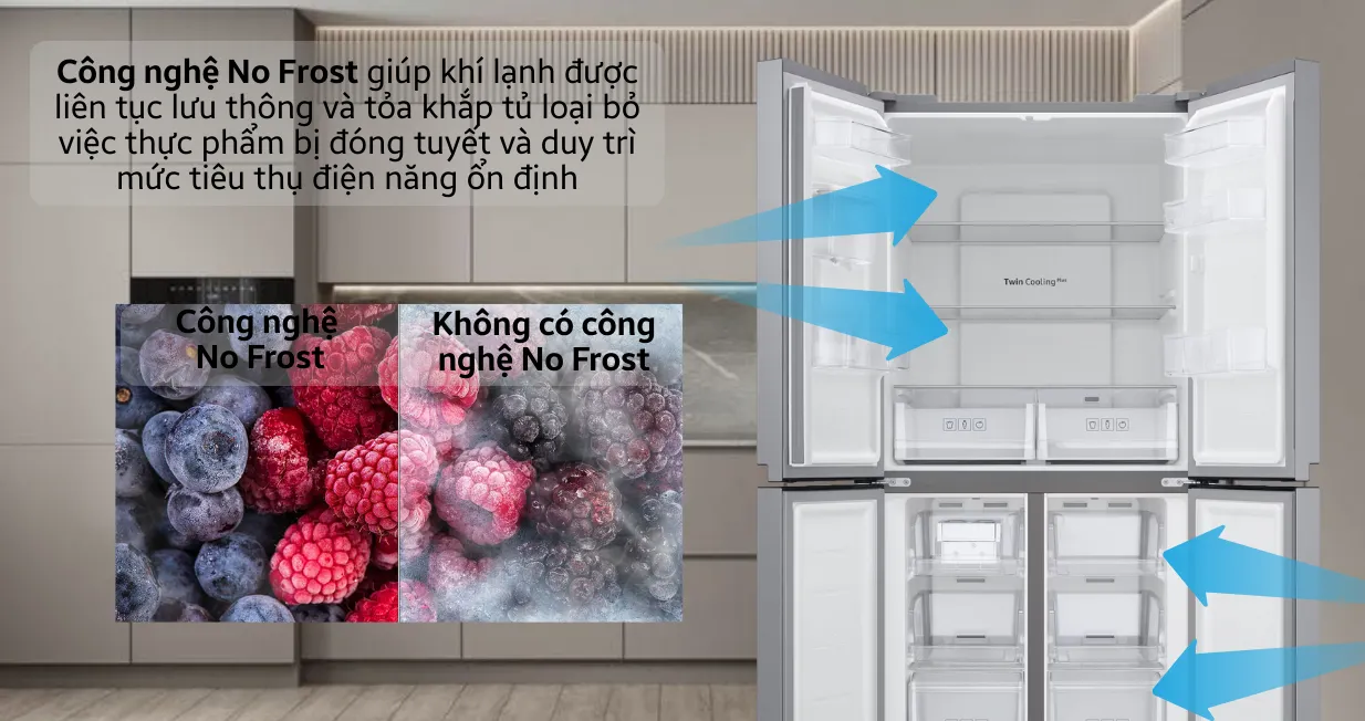 Hơn thế nữa, hệ thống làm lạnh kép còn có khả năng ngăn chặn luồng khí lạnh từ ngăn đông tràn sang ngăn mát. Nhờ vậy, tủ lạnh giúp rau củ, thực phẩm tươi sống không bị khô héo và giữ được độ tươi ngon trong thời gian dài. Mặt khác, công nghệ No Frost còn tự động ngăn chặn sự hình thành lớp tuyết trong ngăn đông.