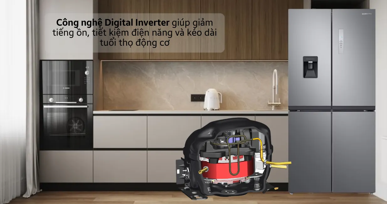 Tủ lạnh Samsung Inverter Multidoor RF48A4010B4/SV 488 lít tích hợp công nghệ Digital Inverter tiên tiến, giúp điều chỉnh tốc độ máy nén tự động theo nhu cầu làm lạnh thực tế. Công nghệ này giúp tủ lạnh hoạt động êm ái, cũng như tiết kiệm điện năng đáng kể. Không những vậy, động cơ Digital Inverter còn có độ bền cao giúp ổn định chất lượng và tuổi thọ của sản phẩm.