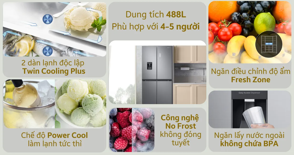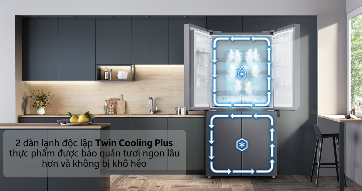 Đặc biệt, 2 dàn lạnh độc lập Twin Cooling Plus hiện đại sử dụng 2 quạt gió để tăng hiệu quả làm lạnh cho 2 ngăn đông và ngăn mát riêng biệt. Với chức năng này, tủ lạnh sẽ giữ thực phẩm lạnh tốt mà vẫn tươi ngon, không bị ám mùi vào nhau. Samsung cũng đã tích hợp chức năng Power Freeze làm đá nhanh, giúp cả gia đình có thể giải nhiệt cấp tốc khi cần.