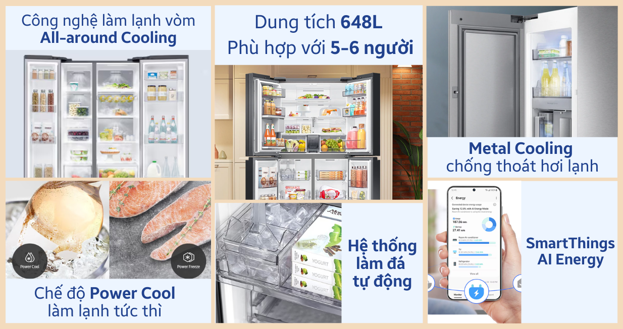 Giảm đến 1 triệu khi thanh toán qua thẻ tín dụng ACBTủ lạnh Samsung Inverter Multidoor RF59C766FB1/SV 648 lít sở hữu thiết kế 4 cánh hiện đại với ngăn đá dưới tiện lợi, phù hợp cho gia đình đông thành viên. Công nghệ Inverter tích hợp tiết kiệm điện năng, cùng SmartThings AI Energy hỗ trợ theo dõi mức tiêu thụ điện. Kết hợp là hệ thống làm lạnh All-Around Cooling và bộ lọc than hoạt tính khử mùi hiệu quả.