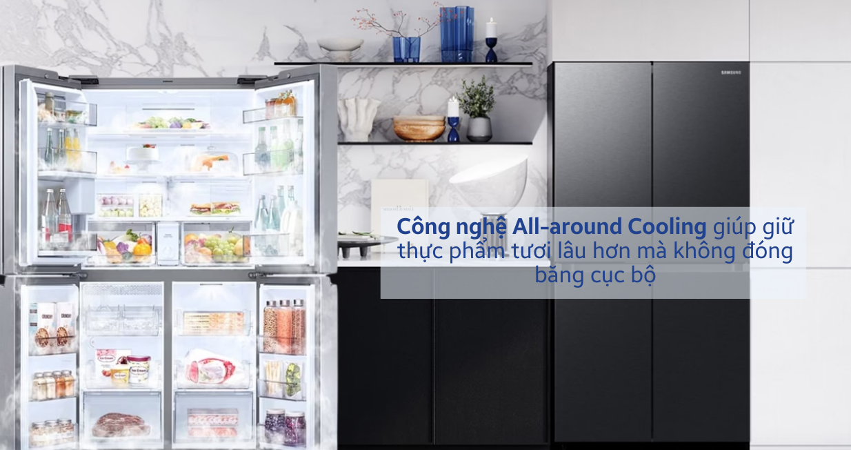 Tủ lạnh Samsung Inverter Multidoor RF59C766FB1/SV 648 lít sử dụng công nghệ All-Around Cooling. Theo đó, luồng khí lạnh được phân bổ đều theo dạng vòng cung, đảm bảo mọi ngóc ngách bên trong tủ đều có nhiệt độ ổn định.