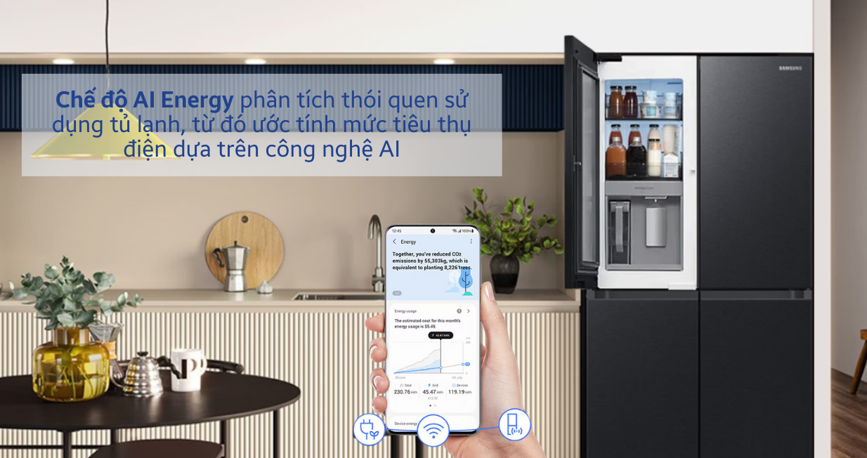 Bên cạnh đó, tính năng SmartThings AI Energy mang đến giải pháp quản lý năng lượng thông minh qua ứng dụng SmartThings. Người dùng có thể tận dụng tính năng để theo dõi mức tiêu thụ điện hàng tháng và tối ưu hóa lượng điện năng sử dụng.