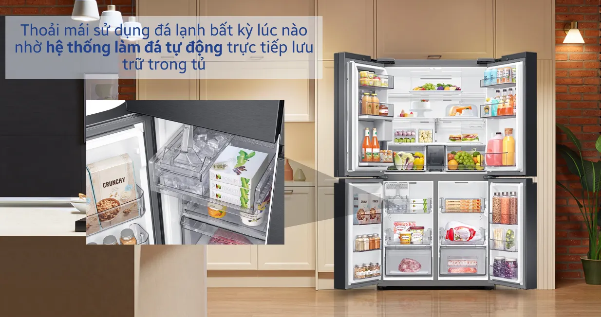 Ngoài ra, Samsung Multidoor RF59C766FB1/SV còn tích hợp nhiều tiện ích thông minh như chế độ làm đá tự động. Kèm theo đó là Hệ thống chuông báo sẽ kích hoạt nếu cửa tủ mở quá lâu, giúp hạn chế lãng phí điện năng. Ngăn lấy nước bên trong cũng được thiết kế kín đáo, đảm bảo vệ sinh và an toàn sức khỏe.