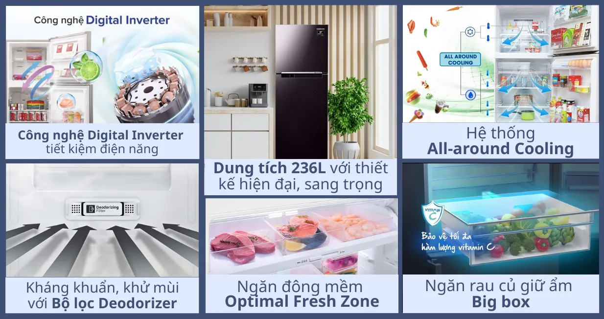 Giảm đến 1 triệu khi thanh toán qua thẻ tín dụng ACBTủ lạnh Samsung Inverter RT22M4032BY/SV 236 lít có sức chứa lớn, sở hữu vẻ ngoài sang trọng với màu đen bóng giúp nâng tầm không gian bếp của gia đình. Sản phẩm được trang bị Digital Inverter - công nghệ hiện đại hỗ trợ tiết kiệm điện năng hiệu quả. Ngoài ra, phiên bản này còn tích hợp công nghệ All-around Cooling, làm lạnh thực phẩm đồng đều.