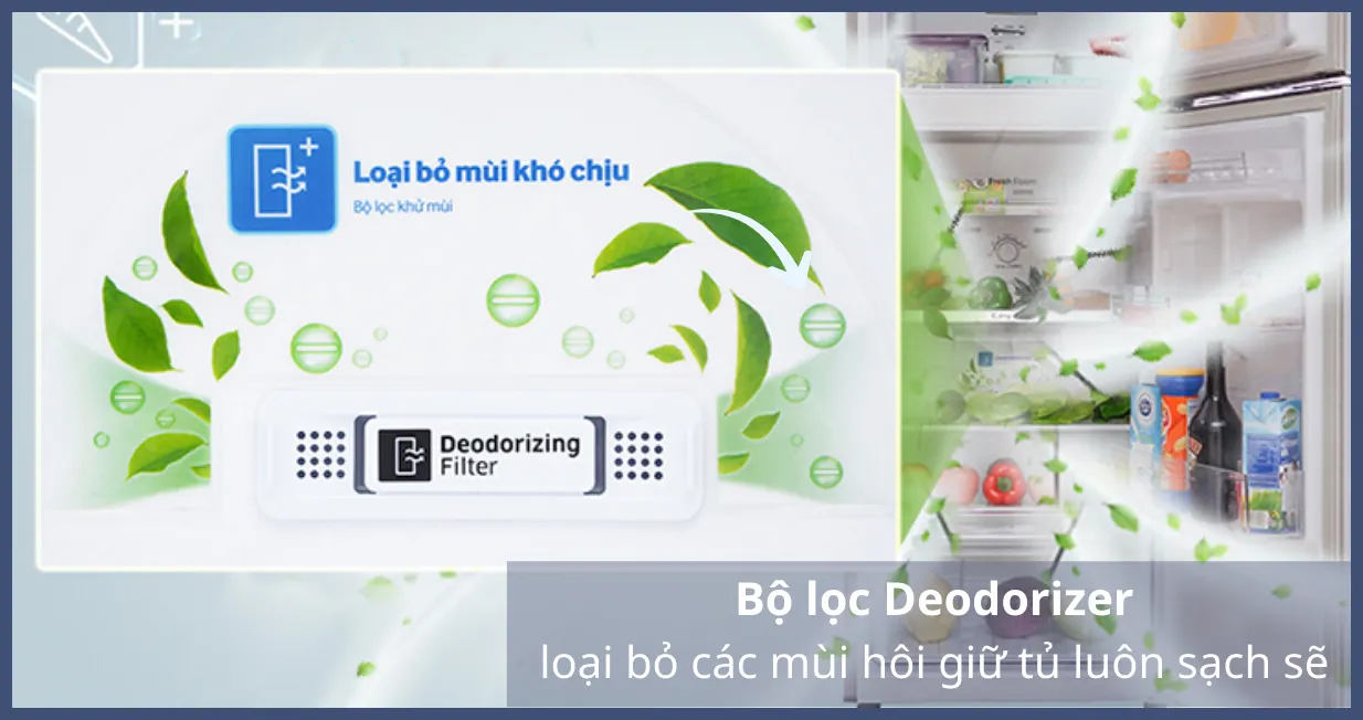 Bên cạnh đó, tủ lạnh Samsung Inverter RT22M4032BY/SV 236 lít còn được trang bị một bộ lọc khử mùi Deodorizer hiện đại bằng than hoạt tính. Hệ thống này có khả năng hấp thụ, loại bỏ mùi hôi và vi khuẩn trong tủ, giữ cho không gian bên trong luôn sạch sẽ, an toàn.