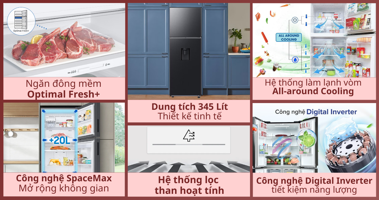 Tủ lạnh Samsung Inverter RT35CG5544B1SV 345 lít sở hữu công nghệ Optimal Fresh+ với 4 chế độ linh hoạt, giúp bảo quản đồ ăn tươi ngon suốt nhiều giờ. Công nghệ SpaceMax giúp tối ưu hóa không gian lưu trữ, tạo sự thuận tiện trong việc sắp xếp thực phẩm. Đồng thời, máy nén Digital Inverter mang lại khả năng tiết kiệm điện, hoạt động êm ái và bền lâu.