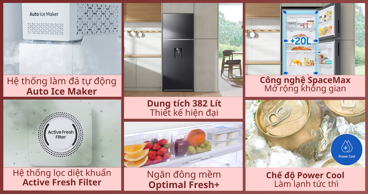 Một điểm cộng nữa dành cho người đam mê các loại thức uống mát lạnh là sản phẩm có thể tự động làm đá viên với công nghệ Auto Ice Maker. Không gian của tủ cũng được tối ưu với chuẩn thiết kế Space Max, giảm tối đa không gian cho các linh kiện từ đó giúp người dùng có thêm 20 lít để trữ thực phẩm.