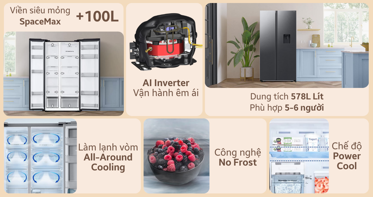 Tủ lạnh Samsung Inverter Side By Side RS57DG410EB4SV 578 lít với công nghệ SpaceMax, giúp tối ưu diện tích lưu trữ mà vẫn giữ nguyên kích thước tổng thể. Hệ thống làm lạnh đa chiều All-Around Cooling giúp duy trì nhiệt độ ổn định, giữ thực phẩm tươi lâu. Mẫu tủ lạnh Samsung này còn có máy nén AI Inverter hoạt động êm ái, tiết kiệm điện và có độ bền cao.
