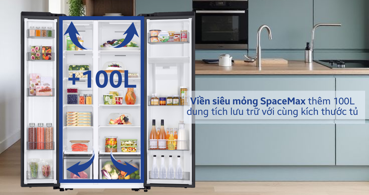 Một trong những điểm nổi bật của Samsung Inverter RS57DG410EB4SV là công nghệ SpaceMax. Công nghệ giúp mở rộng tối đa dung tích lưu trữ mà không ảnh hưởng đến kích thước. Nhờ tối ưu vật liệu cách nhiệt, lớp vỏ tủ lạnh được thiết kế mỏng hơn, giúp tăng thêm 100 lít dung tích sử dụng.