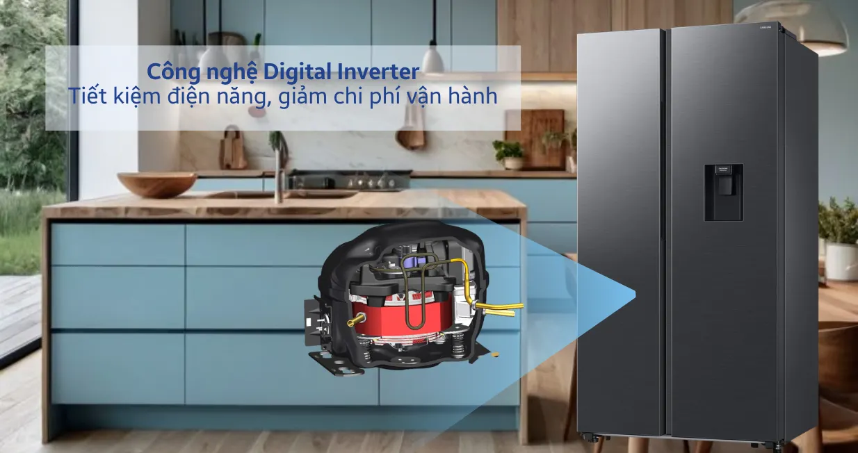 Samsung Inverter RS57DG410EB4SV có bề mặt phẳng, tay cầm ẩn cùng gam màu đen sang trọng tạo nên vẻ ngoài hiện đại. Nó cũng dễ dàng kết hợp với nhiều phong cách nội thất khác nhau.