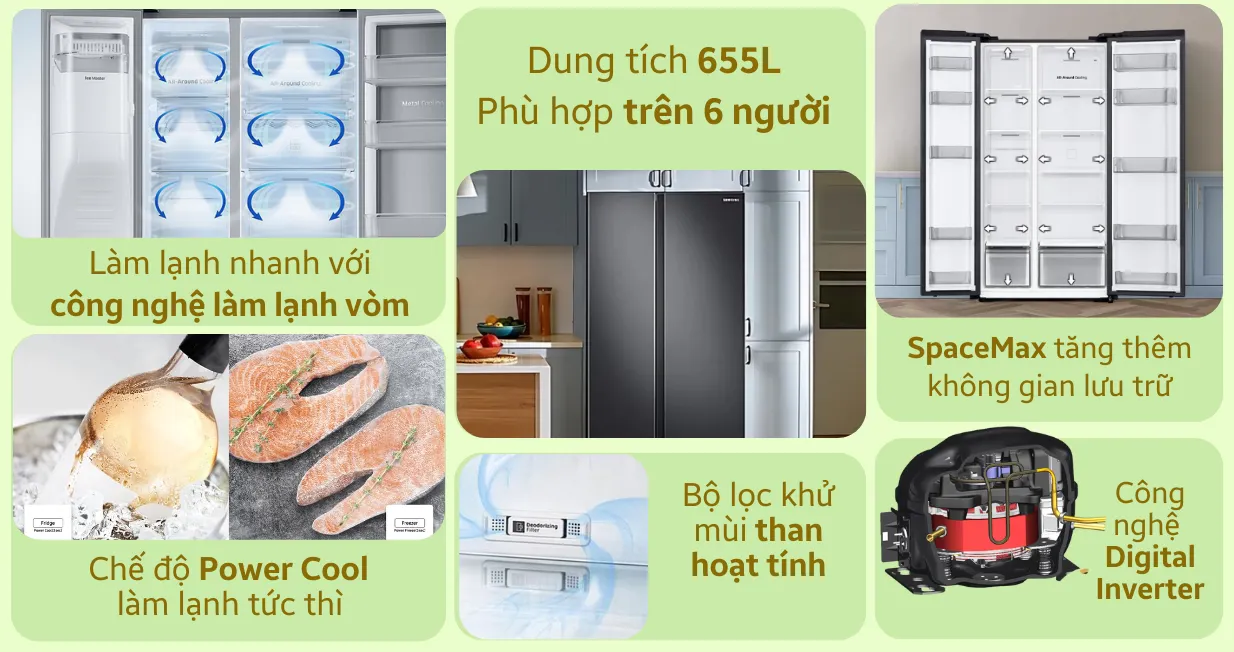 Một trong những điểm nhấn quan trọng của tủ lạnh Samsung Inverter Side by Side RS62R5001B4/SV 655 Lít chính là dung tích lưu trữ lên đến 655L. Nhờ vào công nghệ SpaceMax, sản phẩm có thể tối ưu không gian bên trong mà vẫn đảm bảo khả năng cách nhiệt và vận hành hiệu quả.