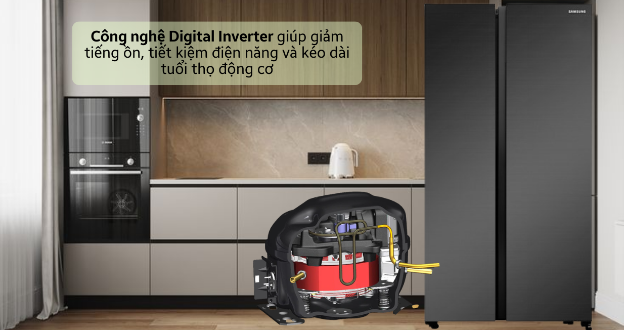 Bên cạnh đó, tủ lạnh Samsung Inverter Side by Side RS62R5001B4/SV 655 Lít có mức tiêu thụ năng lượng khoảng 740 kWh/năm, đạt tiêu chuẩn tiết kiệm điện cấp 3 sao. Ngoài ra, độ ồn của máy nén chỉ ở mức 40 dBA, giúp không gian bếp luôn yên tĩnh, tạo cảm giác dễ chịu khi sử dụng.