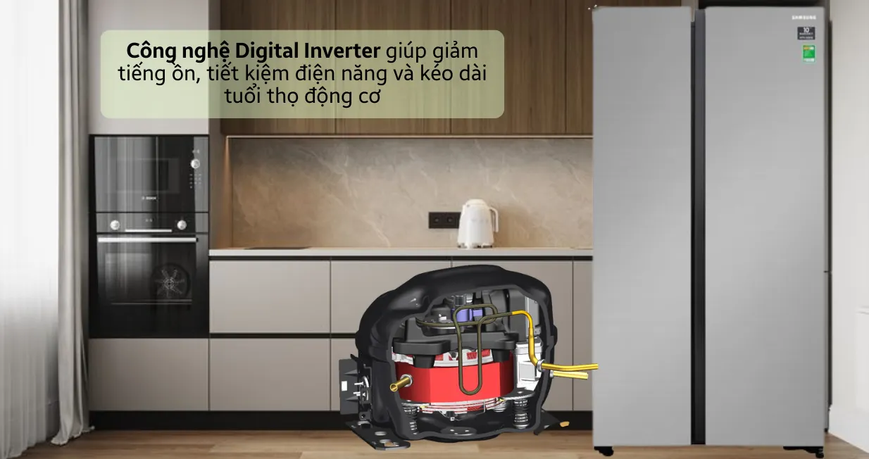 Tủ lạnh Samsung Inverter Side By SideRS62R5001M9/SV 655 lít áp dụng công nghệ Digital Inverter tự động điều chỉnh công suất hoạt động. Ưu điểm này giúp tủ tiết kiệm điện năng và duy trì nhiệt độ ổn định để thức ăn luôn được bảo quản trong điều kiện tối ưu.
