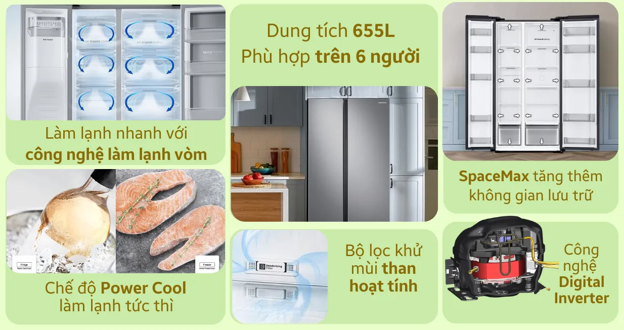Dung tích 655 lít: cấp đông, làm lạnh lượng thực phẩm cho gia đình lớn trên 5 người.