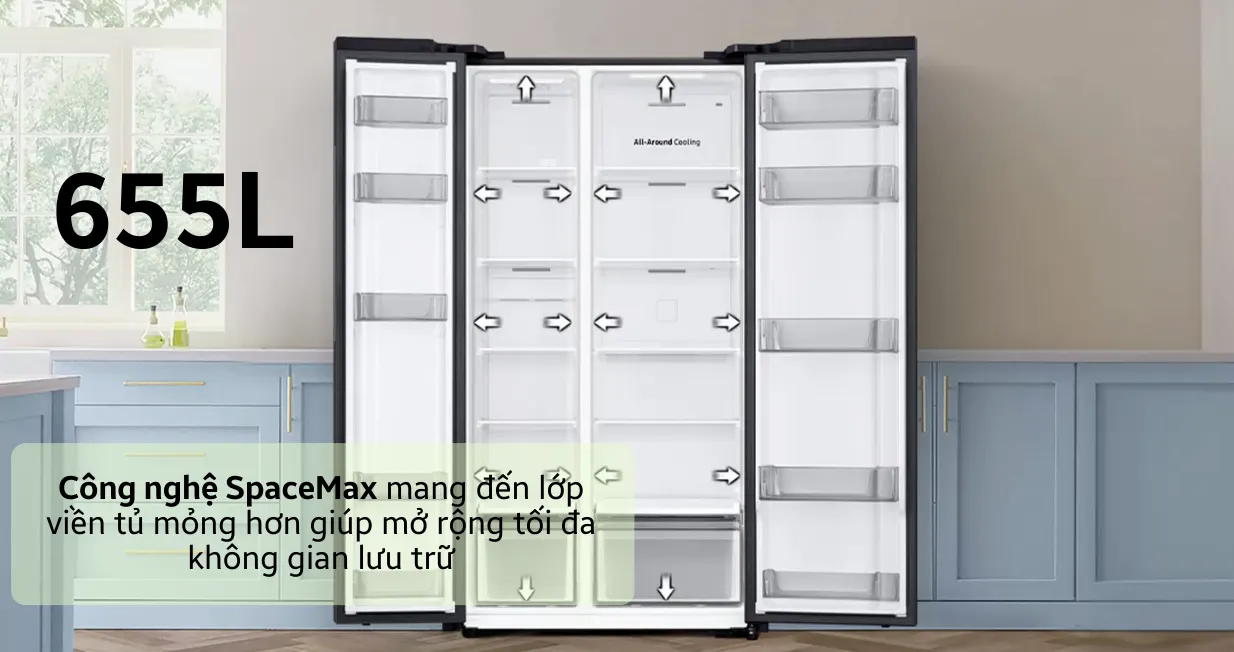 Thiết kế Side By Side với cửa tủ rộng, dễ dàng sắp xếp và lấy thực phẩm. Tay nắm ẩn và bề mặt kim loại cao cấp tạo cảm giác sang trọng, hiện đại.