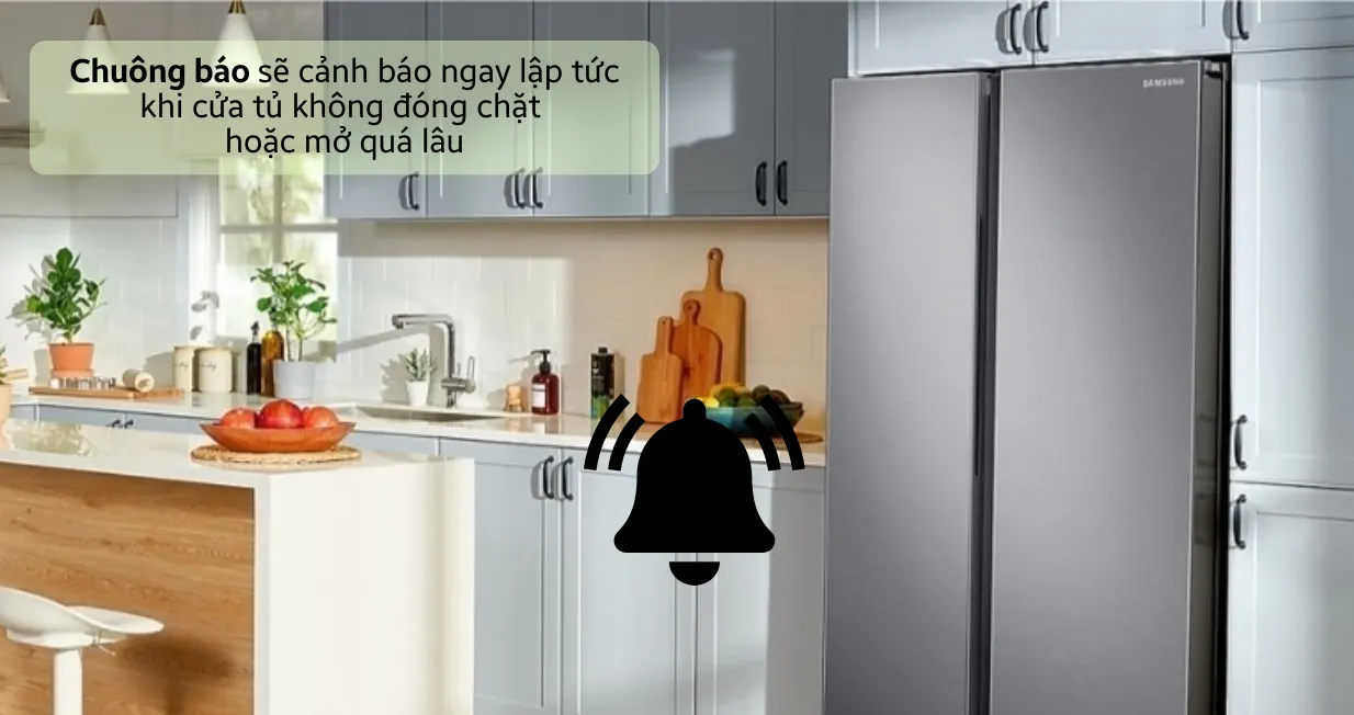 Ngoài ra, sản phẩm cũng được trang bị chuông báo mở cửa để phòng tránh người hợp người dùng quên đóng cửa tủ lạnh. Khi đó, chuông này sẽ phát ra âm thanh thông báo để người dùng nhanh chóng nhận biết và đóng chặt cửa tủ lại, tránh thất thoát khí lạnh làm ảnh hưởng tới chất lượng thực phẩm.