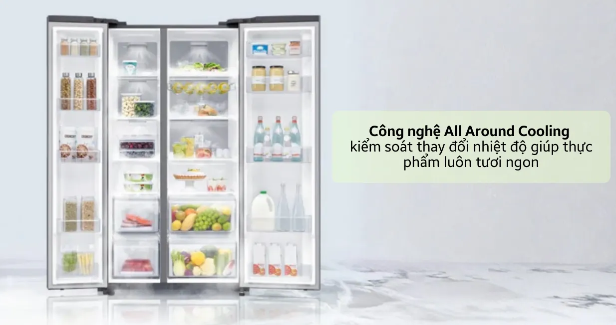 Công nghệ All-around Cooling: phân bổ khí lạnh đều, duy trì nhiệt độ ổn định tạo điều kiện quản thức ăn tốt.