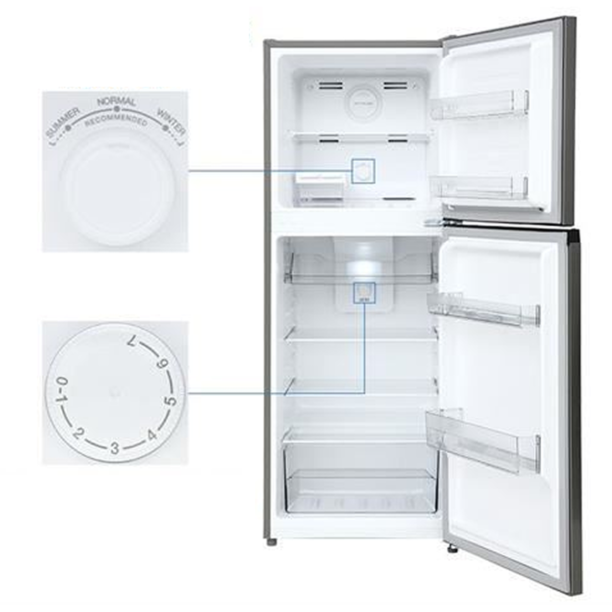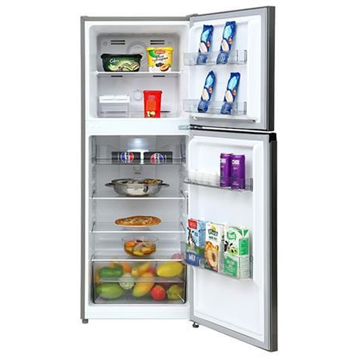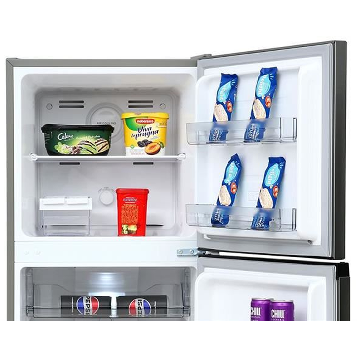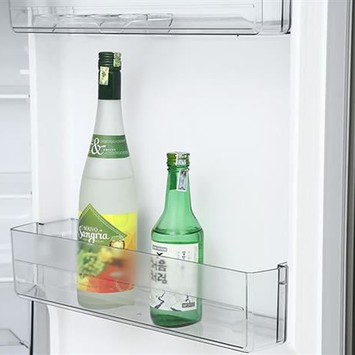 Cánh cửa tủ được tận dụng hiệu quả không gian với 2 ngăn đựng tại cửa ngăn mát và 2 ngăn tại cửa ngăn đông để chứa chai lọ hoặc đồ khô. Các khay kệ này có thể tháo lắp linh hoạt, giúp người dùng dễ dàng vệ sinh định kỳ cũng như đáp ứng nhu cầu thay đổi vị trí sắp xếp thực phẩm.
