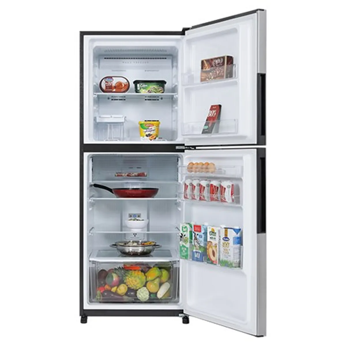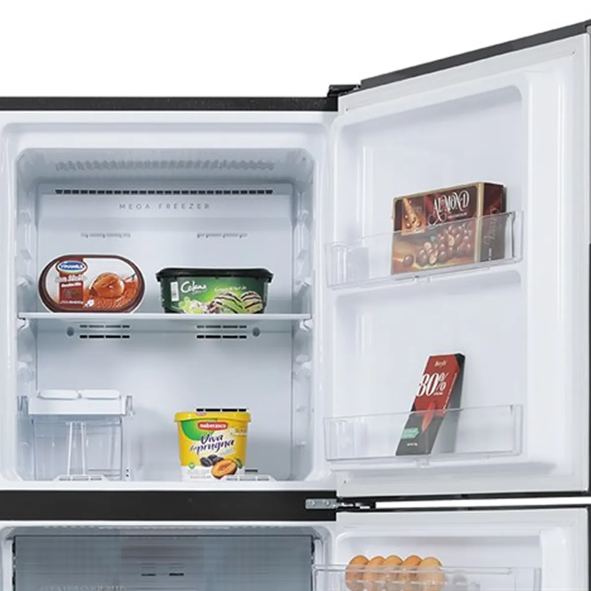 Model tủ lạnh Sharp này sở hữu dung tích thực 330 lít, trong đó điểm nhấn là ngăn đông lớn lên đến 107 lít giúp thoải mái tích trữ thực phẩm. Không gian lưu trữ được tối ưu hóa thông minh, cho phép người dùng có thể chứa được cả những chai nước 2 lít một cách dễ dàng.