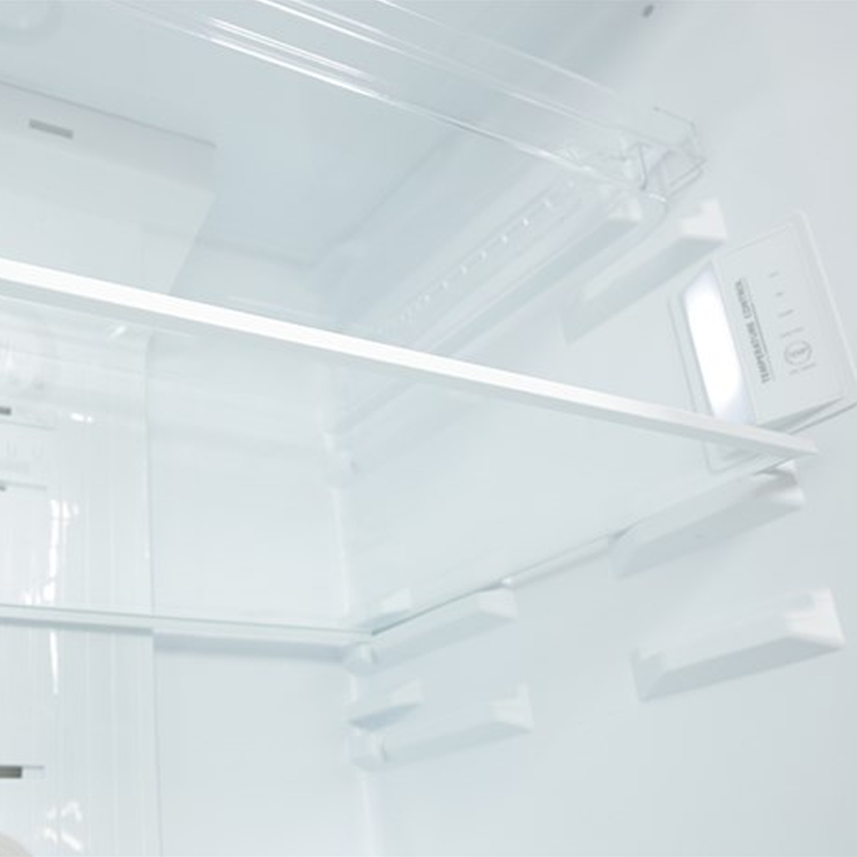 Khu vực ngăn lạnh được sắp xếp nhiều kệ kính cường lực có khả năng chịu tải đến 100 kg, hỗ trợ đặt nồi, khay hoặc hộp thực phẩm kích thước lớn. Cách bố trí kệ linh hoạt giúp dễ tùy chỉnh chiều cao, tối ưu không gian cho từng loại thực phẩm khác nhau.