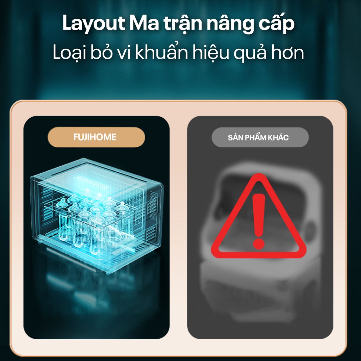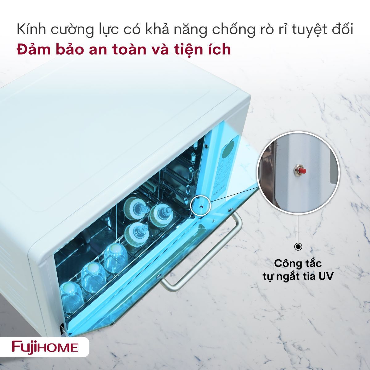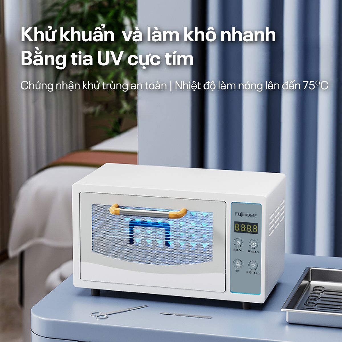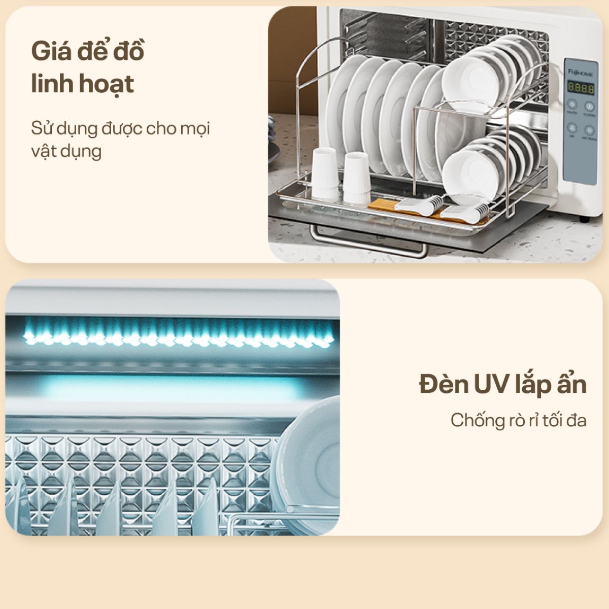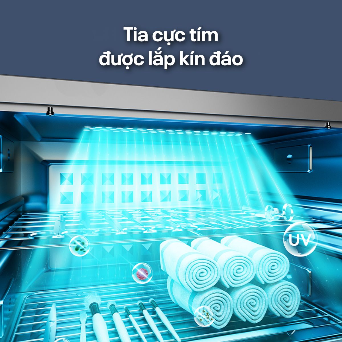 | Tiện ích | Sử dụng tia UV và Ozone có khả năng tiêu diệt đến 99.99% vi khuẩn |
