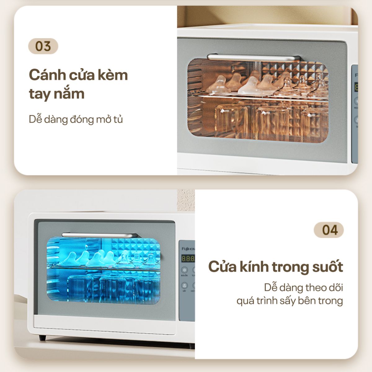 | Tính năng khác | 4 chế độ : Sấy tự động kết hợp khử trùng, sấy, khử trùng, bảo quản vô trùng |