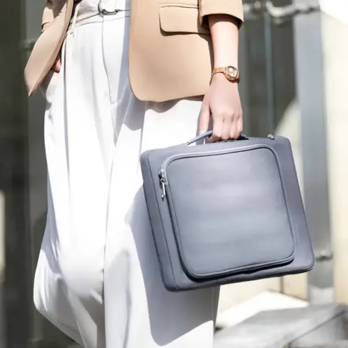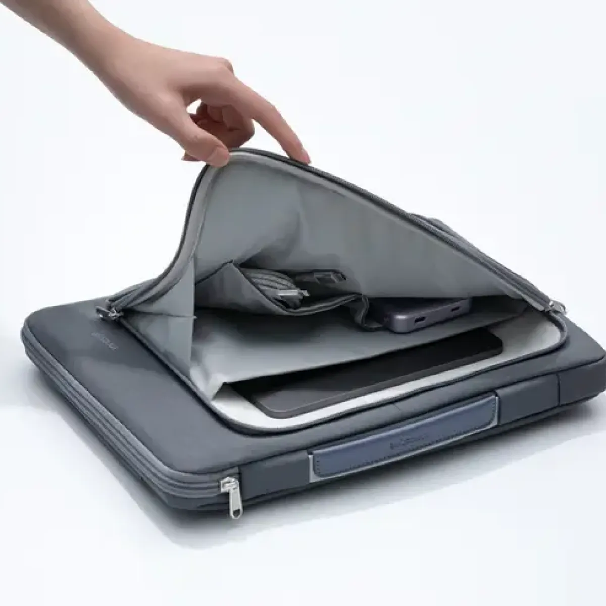 Bên ngoài túi còn có một ngăn phụ rộng rãi để chứa các phụ kiện như sạc, chuột, hoặc điện thoại, giúp người dùng tiện lợi hơn khi mang theo laptop và các vật dụng cá nhân. Thiết kế tổng thể nhẹ nhàng, gọn gàng, rất phù hợp cho người thường xuyên di chuyển, vừa bảo vệ thiết bị an toàn vừa thể hiện phong cách chuyên nghiệp.