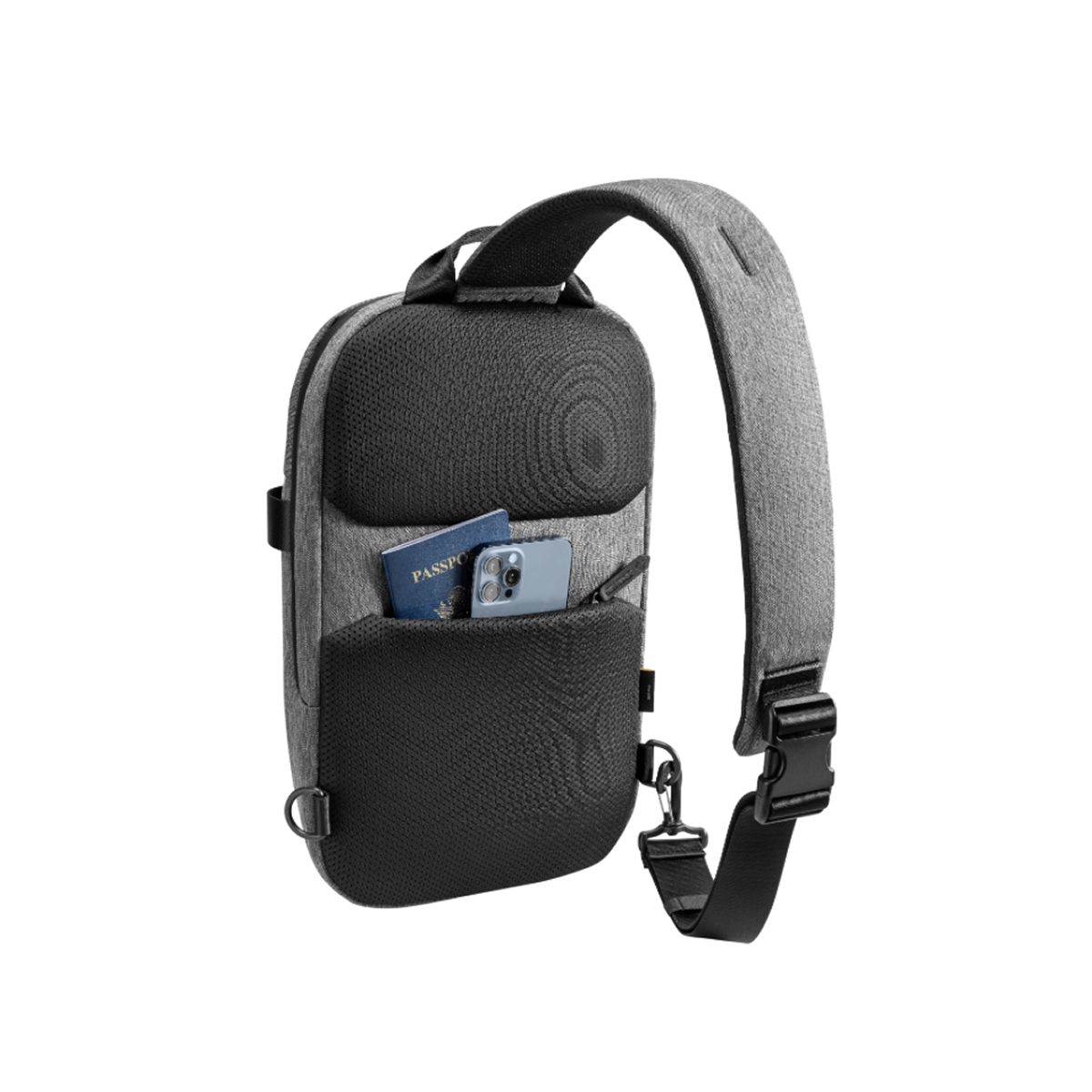 Thiết kế hai móc cài linh hoạt, cho phép người dùng chuyển đổi tư thế đeo bên trái/phải chỉ trong vài giây. Khả năng tùy chỉnh linh hoạt giúp phân bổ lực đều lên đôi vai, từ đó giảm thiểu cảm giác nhức mỏi khi mang theo thiết bị trong thời gian dài.