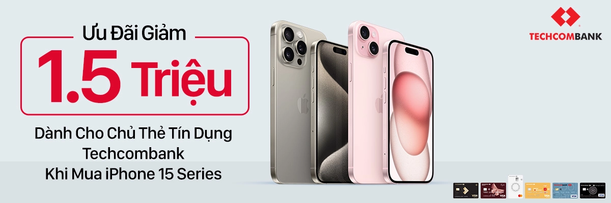 GIẢM 1.5 TRIỆU KHI THANH TOÁN IPHONE 15 SERIES BẰNG THẺ TÍN DỤNG TECHCOMBANK