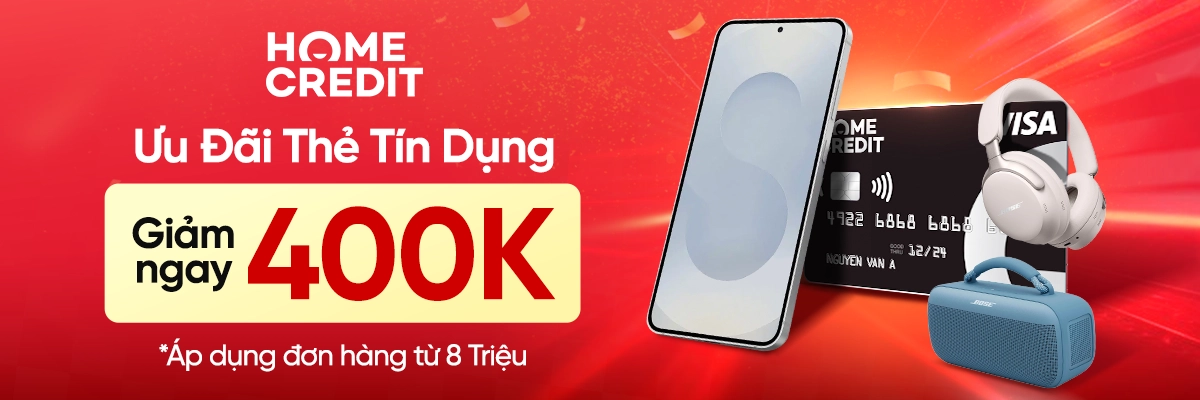 - Khách hàng mua hàng tại các cửa hàng CellphoneS và thanh toán qua thẻ tín dụng HOMECREDIT sẽ được giảm 400.000VNĐ khi mua đơn hàng có giá trị từ 8 triệu trở lên