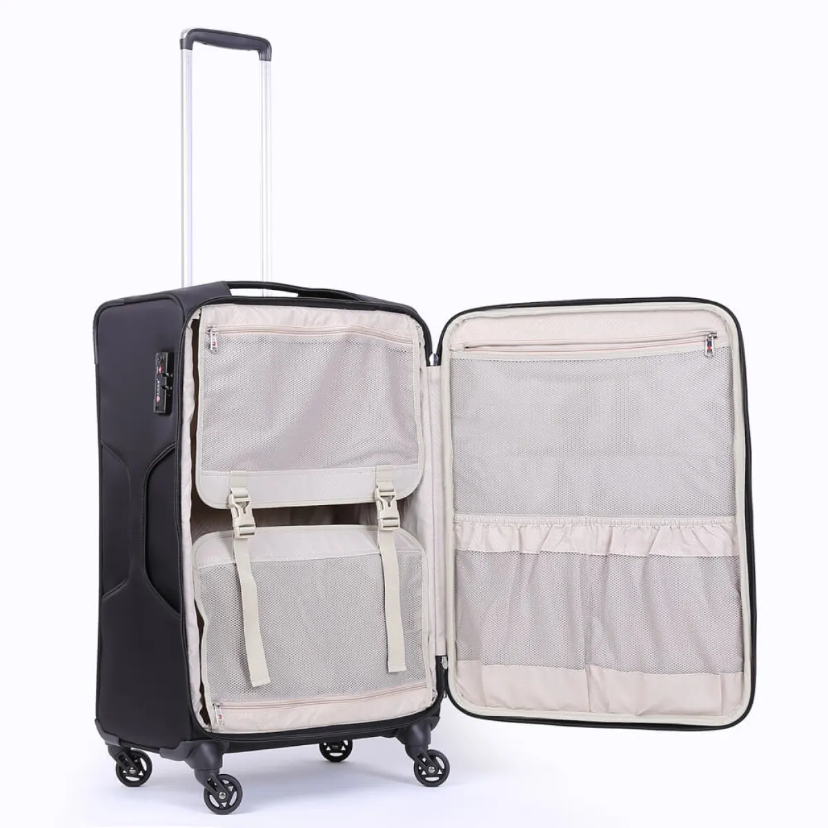 Khung viền nhựa PE dẻo dai giúp sản phẩm giữ được phom dáng thanh lịch trong quá trình di chuyển. Trọng lượng nhẹ hỗ trợ người dùng mang theo nhiều hành lý hơn mà vẫn tuân thủ đúng các quy định hàng không.