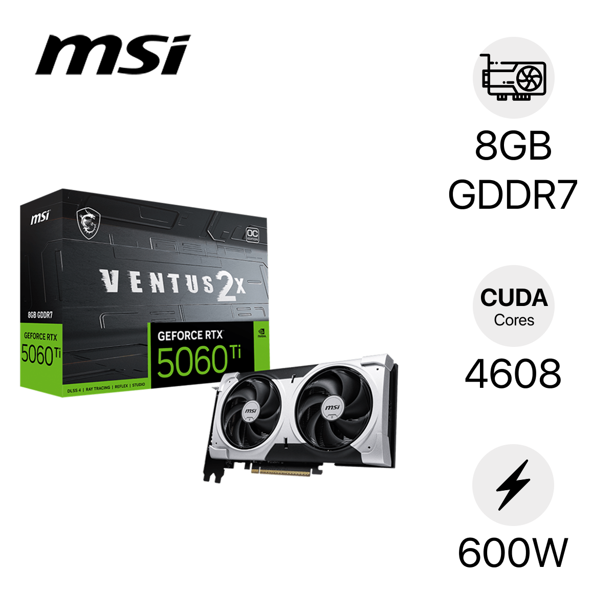 VGA MSI GeForce RTX 5060 Ti 8G VENTUS 2X PLUS mang lại hiệu năng xử lý đồ họa mạnh mẽ nhờ trang bị kiến trúc NVIDIA Blackwell đột phá trên tiến trình mới. Chip đồ họa hỗ trợ xung nhịp nhân đạt mức 2587MHz khi kích hoạt phần mềm MSI Center. Thiết bị sử dụng bộ nhớ 8GB GDDR7 với tốc độ băng thông 28 Gbps.